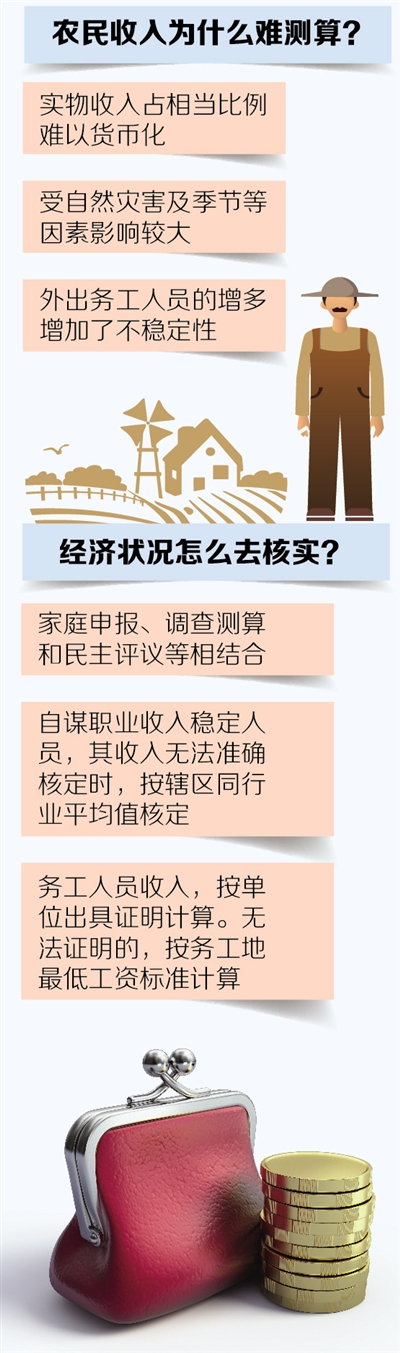 但农民收入难以精确测算核查。农民收入中实物收入占相当比例,价值转化过程中存在较大的随意性,难以货币化。而且,农民收入受自然灾害及季节等因素影响较大,加之外出务工人员的增多,增加了收入的不稳定性。因而,对于农村家庭的财产状况与收入,我们采取家庭诚实申报、调查测算和民主评议等相结合的办法进行确定。