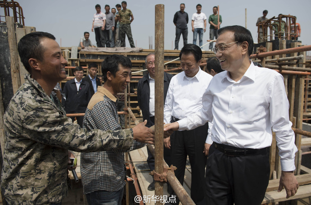 5月22日,在赤峰污水处理项目工地李克强与农民工交谈。