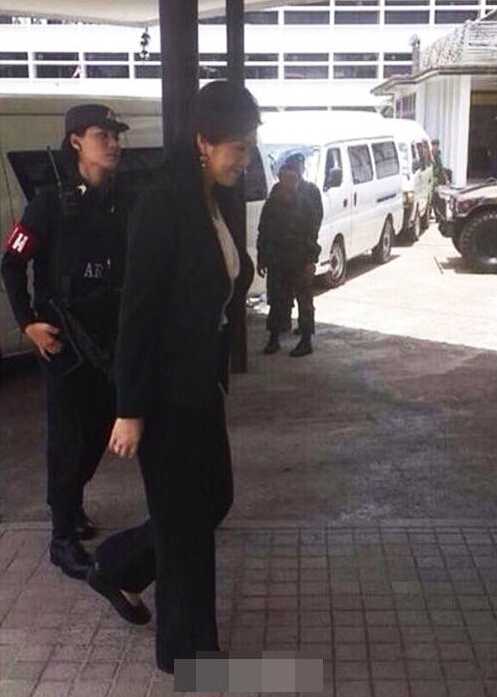 泰国发生军事政变后5月23日,泰国前总理英拉面带微笑在手持乌兹冲锋枪的女军人押送下进入“军事维安委员会”报告,目前她下落不明。