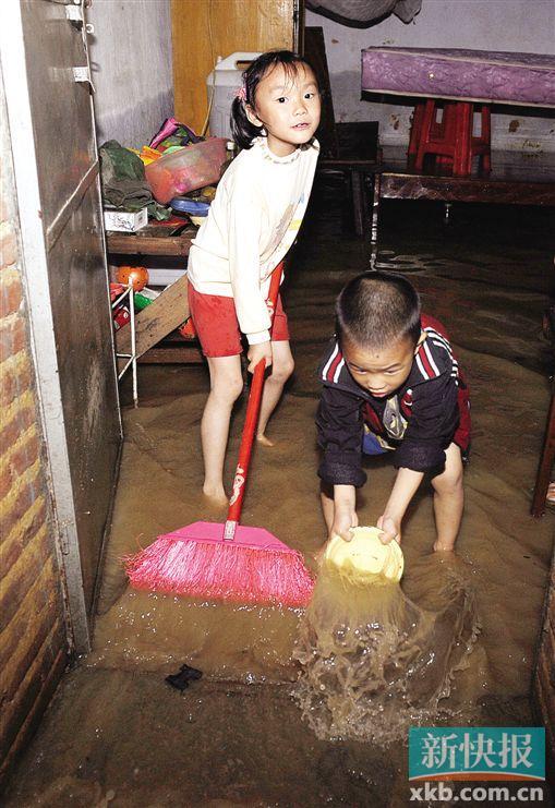 ■从化良口镇一村民家中积水严重,孩子们帮助爸爸妈妈在清理积水。