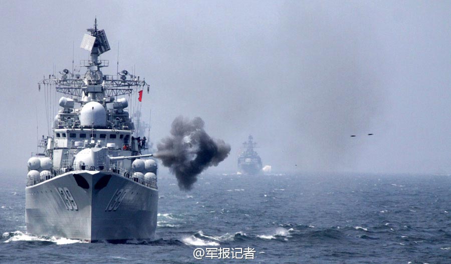 5月24日下午1时许,东海某海域突然间炮声四起,中俄联合编队6艘舰艇进行了对"舰"射击、火箭深弹攻"潜"、对空实射等演练,下午2时50分,随着海上实际使用武器演练结束,历时3天的中俄"海上联合一2014"军事演习海上课目全部完成。