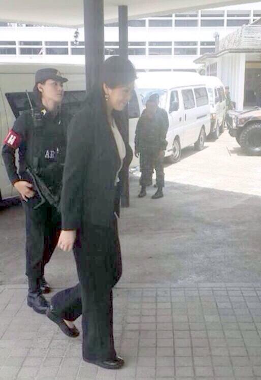 泰国发生军事政变后5月23日,泰国前总理英拉面带微笑在手持乌兹冲锋枪的女军人押送下进入“军事维安委员会”报到。