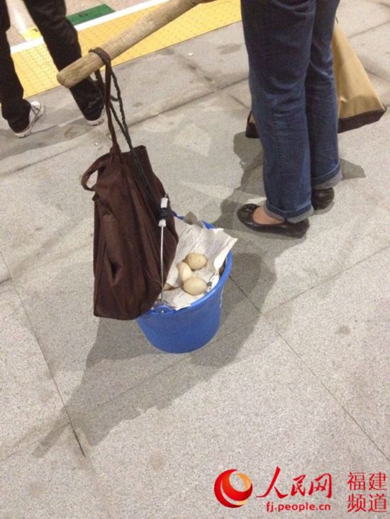 在动车漳浦站上车前,这位母亲告诉记者,她为了赶这趟车,一个下午忙得满头大汗。提前一个小时左右就从家里来车站等待。她用来挑两桶蛋的扁担有点短,也比较旧,上面都有些残破发白了。“没想到这二三十斤的蛋这么重?;购糜卸蹈奖憷病?rdquo;她告诉记者,桶里那些大的蛋是番鸭蛋,还有一些是土鸡蛋,而这些蛋都是自己家里养的鸡鸭生的。