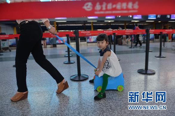 5月22日,一名家长带着女儿在南京禄口机场办理登记手续。 新华社记者 沈鹏 摄