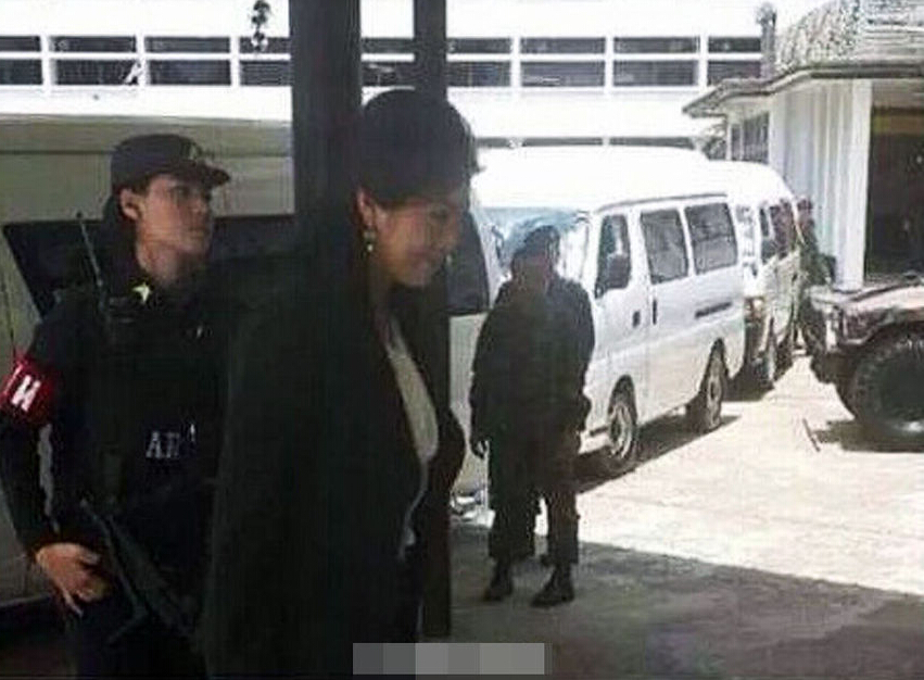 泰国发生军事政变后5月23日,泰国前总理英拉面带微笑在手持乌兹冲锋枪的女军人押送下进入“军事维安委员会”报告,目前她下落不明。