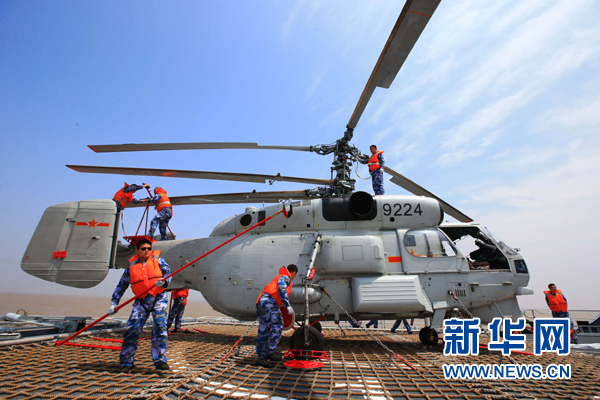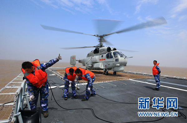 5月22日,航空兵地勤人员在郑州舰上准备直升机发动机冲洗车。当日,中俄“海上联合—2014”军事演习的参演军舰驶离上海某军港,驶往演习海区。航行途中,导弹驱逐舰郑州舰上的舰载直升机进行了飞行前预先机务准备。新华社记者 查春明 摄
