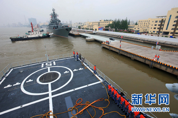 5月22日,中国海军导弹驱逐舰郑州舰正在驶离码头。新华社记者 查春明 摄