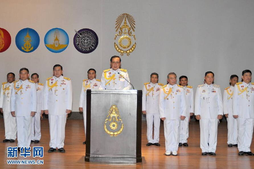 5月26日,在泰国曼谷,泰国陆军司令巴育(前)出席新闻发布会。泰国陆军司令巴育26日接受国王谕令,出任“全国维持和平秩序委员会”(维和委员会)主席。巴育随后承诺国家将产生过渡总理,但拒绝透露具体时间。新华社发(拉亨摄)