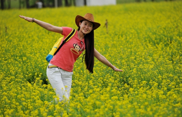 5月28日,在辽宁省朝阳市喀左县六官营子镇,游人在白菜花田中留影。