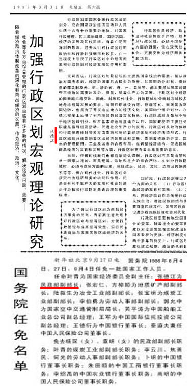 第一次发表署名文章是1989年3月31日第6版的《加强行政区划宏观理论研究》,是一篇关于行政区划的学术文章,讲到了行政区划调整要注意与经济、社会相协调的问题。他第一次被报道,则是1986年9月18日的“国务院任免名单”中被任命为民政部副部长。?