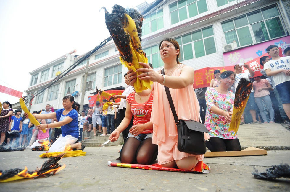 新华网,据凤凰网报道,6月6日,武汉新洲二中门口,鞭炮、礼花、礼炮也于8时8分同时被点燃。上万名居民自发聚集到校门口的路边,为即将去邾城街参加高考的千余名考生送行。警车开道,66辆送考车依次驶出校门。此时,送考家长和村民烧纸跪拜,点燃鞭炮,锣鼓喧天。