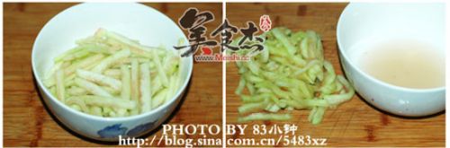 1. 厚皮西瓜皮去掉外面的绿色硬皮,去掉里面的红瓤,洗净切薄片,加盐腌15分钟左右