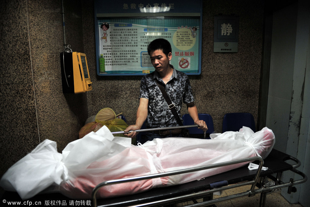 2014年6月11日上午,福州,重症病房外,父亲吴明对着小婷的遗体发呆。