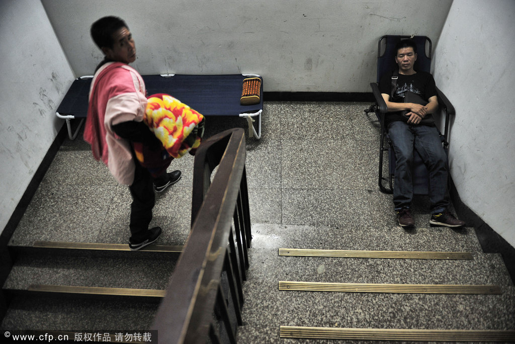 2014年6月3日上午,福州,省立医院,吴明每天就睡在ICU外面的楼道上,为了方便照顾小婷。