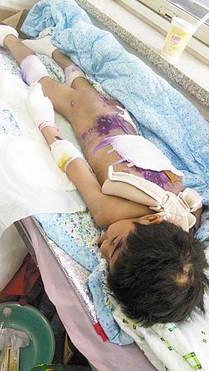 昨日下午,记者在保定市第一中心医院见到彤彤时,她正因为剧烈头疼在病床上抽搐着蜷缩成一团。在她上身,布满了大块吓人的伤疤。手指甲很多已经脱落,露出下面的红色嫩肉来。头发稀稀疏疏,很多地方头皮都露了出来。医生介绍说,除了能看到的外伤,彤彤的全部指骨都骨折,右脚趾骨骨折,右侧锁骨骨折,腹部因炎症积水,颅内有积液,部分颅骨间隙有明显增大。