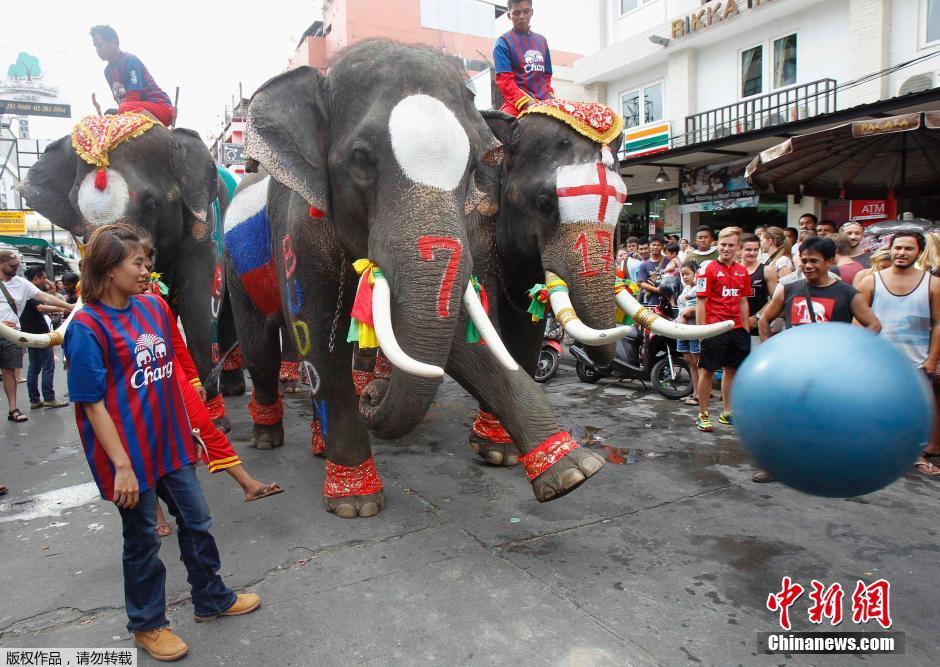 当地时间2014年6月13日,曼谷,庆祝巴西世界杯开幕,曼谷街头惊现大象足球世界杯。大象们被涂上各国国旗在街头“踢球”,吸引众人观看。
