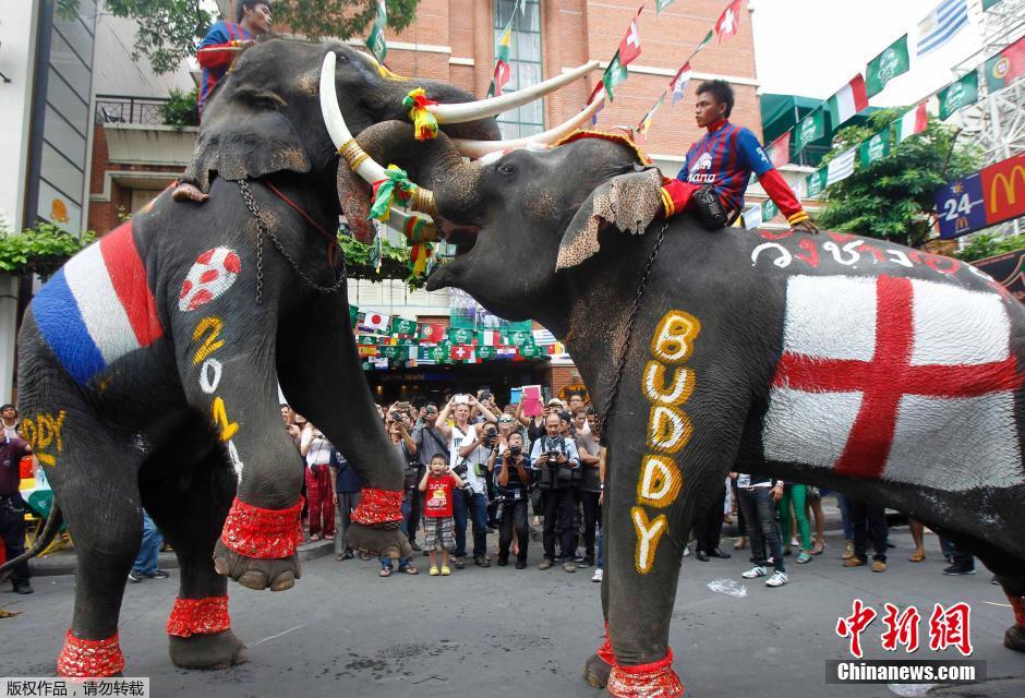 当地时间2014年6月13日,曼谷,庆祝巴西世界杯开幕,曼谷街头惊现大象足球世界杯。大象们被涂上各国国旗在街头“踢球”,吸引众人观看。