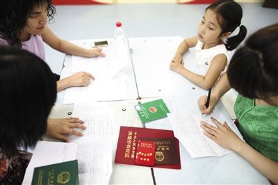 在原东城区花市小学,家长和孩子在进行现场信息审核。昨天,全市各小学开始现场审核“幼升小”适龄儿童的信息。记者 浦峰 摄