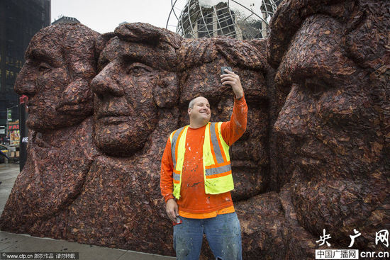 当地时间2014年6月12日,美国纽约,美国杰克林克牛肉干公司为庆祝6月12日举办的第三届国际牛油干节,用肉干仿造美国拉什莫尔山(美国总统山)的总统雕像,场面非常壮观。据悉,杰克林克牛肉干公司动员20名员工,耗费1400个小时才制作出13英尺(约4米)高,17英尺(约5米)宽,体积1400立方英尺(约40立方米),重达1600磅(约725公斤)的庞然大雕塑。