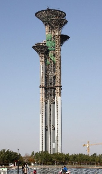 这是北京奥林匹克公园瞭望塔正在建设时候的照片。瞭望塔由五个高低不等的独立塔构成,其中一号塔最高为244.35米。因其外形像五颗“大钉子”遭网友调侃。