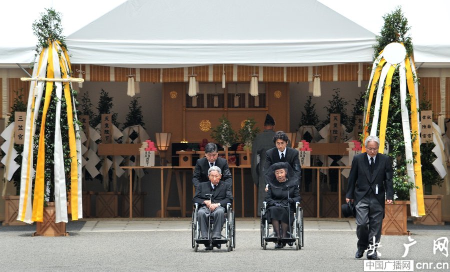 当地时间2014年6月17日,日本东京,日本天皇的堂弟、桂宫宜仁亲王的葬礼在东京都文京区丰岛冈墓地举行,日本皇太子夫妇、秋筱宫夫妇及真子公主出席。图为桂宫亲王的父母三笠宫亲王夫妇在葬礼上。