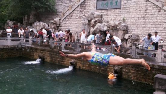 2014年6月15日,济南,在省城七十二泉黑虎泉景区,不少游泳爱好者在黑虎泉里游泳,并且冒险玩跳水。