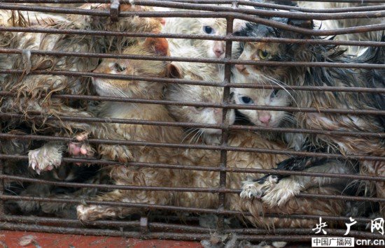 2014年06月19日,在太原市尖草坪区阳曲镇阳曲村附近的一家饭店院内,有一百多只猫被装在铁笼中。