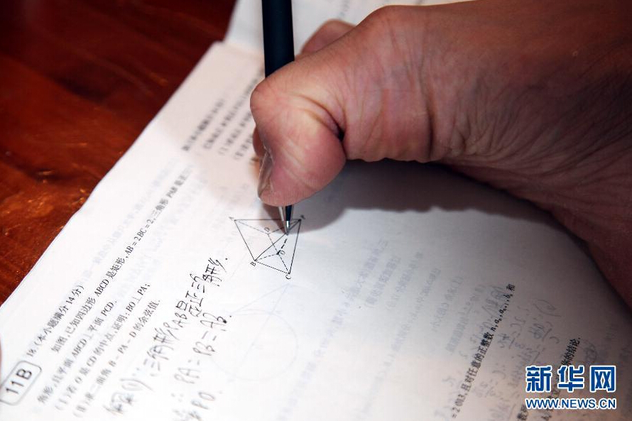 彭超的分数比一本线540分差了两分,但加上当地照顾政策,他将获5分加分资格,这样刚超一本线3分。图为6月5日,攀枝花市第七高级中学无臂男孩彭超放学回家后在复习功课冲刺高考。