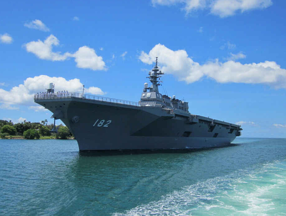 “伊势”号是日本最近建造的一艘超大型直升机驱逐舰,2009年8月21日在横滨举行了命名和下水仪式。该舰长197米,宽33米,标准排水量1.395万吨,不仅远远超过日本其他型号的驱逐舰,甚至还超过了一些国家的轻型航母。其船型采用与航母相同的直通式甲板,上层建筑位于甲板一侧。该舰可同时起降4架直升机,机库最多可容纳11架直升机。该舰配有4台燃气轮机,输出功率达10万马力,航速可达30节。图为日本海自队伊势号直升机驱逐舰抵达珍珠港。