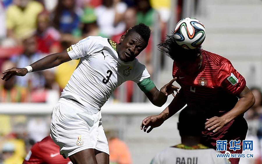 6月26日,加纳队球员阿•吉安(左)与对方球员争顶。当日,在巴西巴西利亚马内·加林查国家体育场进行的2014年巴西世界杯小组赛G组比赛中,葡萄牙队对阵加纳队。 新华社记者戚恒摄