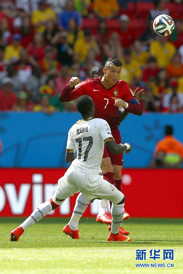 6月26日,葡萄牙队球员克·罗纳尔多(上)在比赛中争顶。当日,在巴西巴西利亚马内·加林查国家体育场进行的2014年巴西世界杯小组赛G组比赛中,葡萄牙队对阵加纳队。 新华社记者刘彬摄