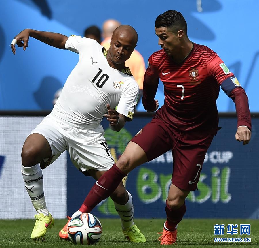 6月26日,葡萄牙队球员克·罗纳尔多(右)与加纳队球员安•阿尤拼抢。当日,在巴西巴西利亚马内·加林查国家体育场进行的2014年巴西世界杯小组赛G组比赛中,葡萄牙队对阵加纳队。 新华社记者戚恒摄