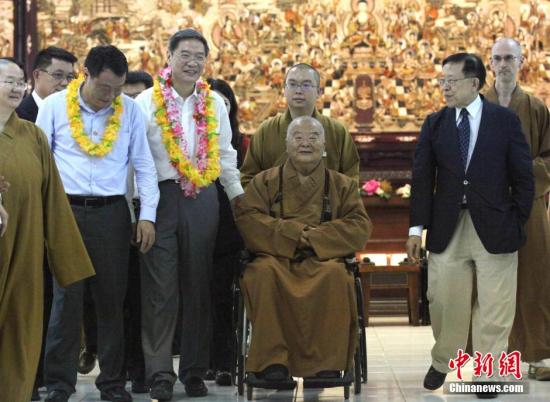 6月27日,国台办主任张志军(右五)来到高雄佛光山,拜会星云大师时,他许了个愿,希望两岸以亲情与智慧化解心结,大家携手为两岸同胞的福祉和明天付出努力。中新社记者 陈小愿 摄