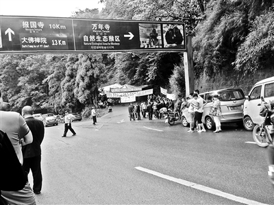 据介绍,峨眉山景区分为高山区、中山区、低山区。暂不接待游客的万年、清音阁片区属于中山区。通往这两处景点比较便捷的路线,是经由五显岗停车场、万年停车场附近的两个售票入口进入景区。但截至昨晚7点,通往这两个停车场的村道都聚集着村民。