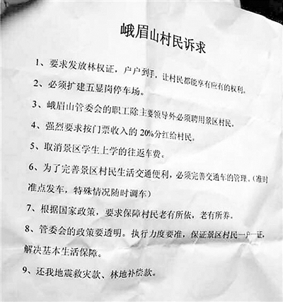 有万年村村民提供给北青报记者的诉求,包括“还给村民林权证”、“地震灾后救灾款项的去向”、“景区门票收入的20%以分红形式返还给村民”等民生问题,他们表示,村民为景区发展退耕还林,但是多年来很少收益。
