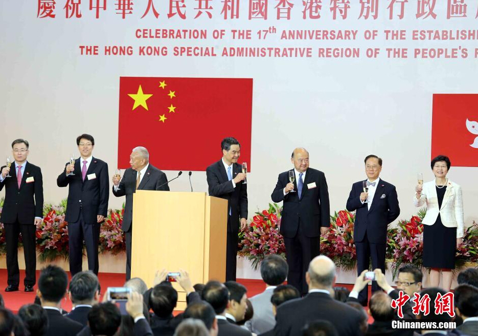 7月1日上午,香港特区政府在会展览中心举行香港特区成立十七周年庆祝酒会。行政长官梁振英为酒会主礼,出席的嘉宾约有一千二百位,包括行政会议成员、立法会议员、外国使节,以及社会各界人士。中新社发 洪少葵 摄