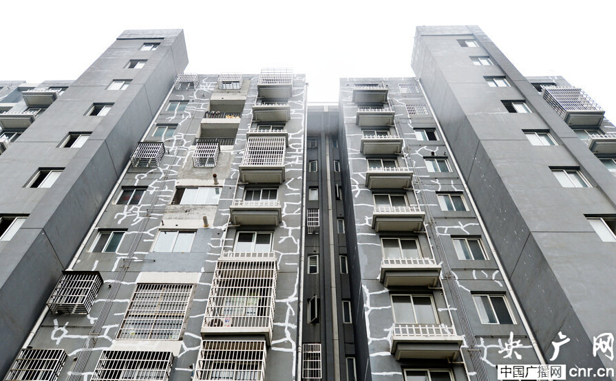 2014年7月1日,江苏常州,武进区遥观镇宋剑湖家园的一幢安置房像“缠满了绷带”,看上去很不美观 。(来源:中国广播网)