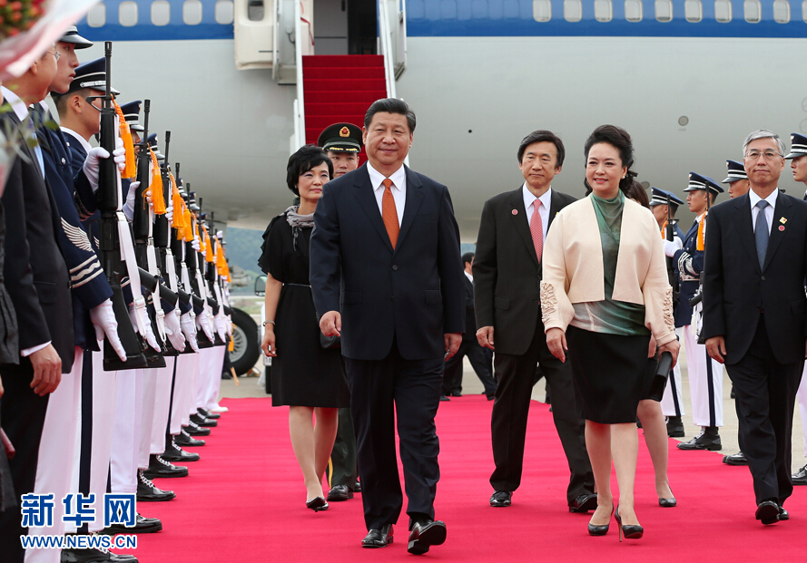 当地时间3日中午12时10分许,习近平乘坐的专机抵达首尔城南机场。当习近平和夫人彭丽媛走出机舱时,鸣礼炮21响。韩国外长尹炳世等韩方高级官员在舷梯旁迎接。韩方礼兵沿着红地毯两侧列队,向习近平行注目礼。