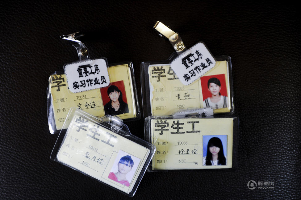东莞东坑电子厂为来自广西平南县未满16岁初中生所办理的入厂工牌,他们都被冠以“学生工”的名号。宇飞/摄