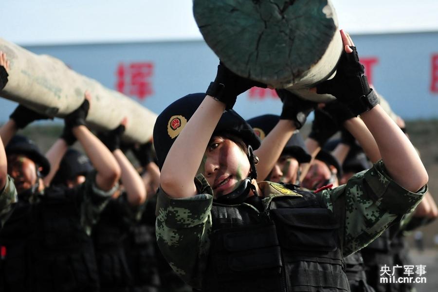 新疆公安边防总队训练基地女子特战队员正在进行托举圆木训练。