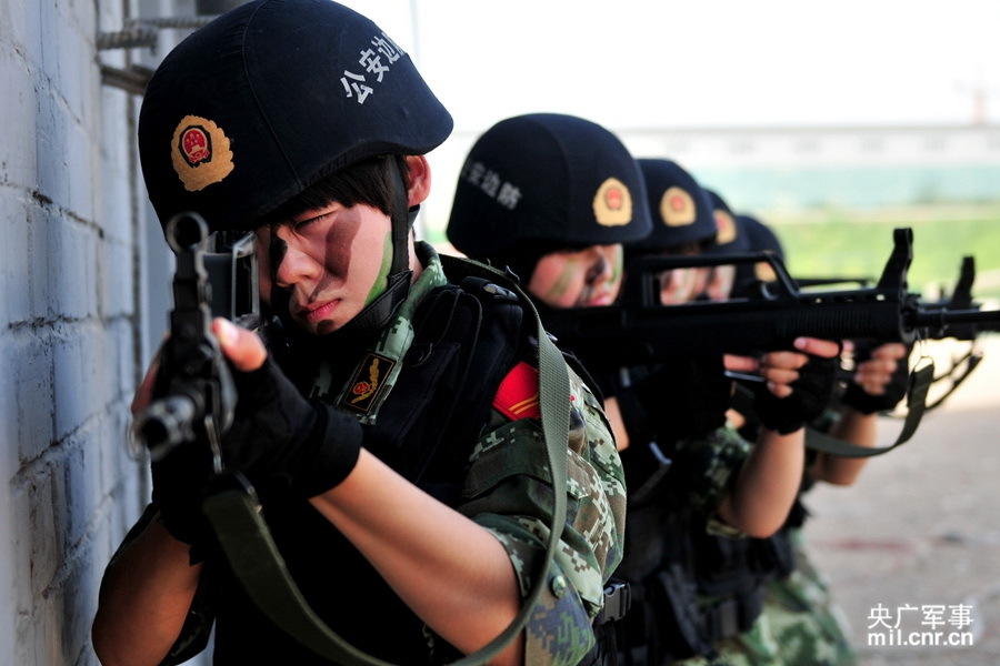 新疆公安边防总队训练基地女子特战队员正在进行小组战术训练。