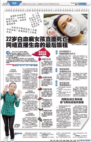 去年1月,《22岁普通女孩:直播生命的最后旅程》的帖子在网上一发出,重庆晚报记者立即与飞燕取得联系,1月26日,本报关于飞燕的报道刊发后,在社会上引起强烈反响。