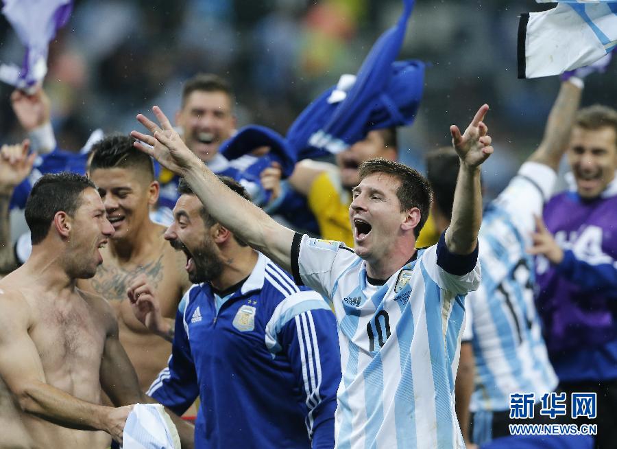 7月9日,阿根廷队球员莱•梅西(前)与队友在比赛后庆祝胜利。当日,在巴西圣保罗伊塔盖拉球场进行的2014年巴西世界杯半决赛中,阿根廷队与荷兰队在120分钟内战成0比0平。最终通过点球大战,阿根廷队以4比2战胜荷兰队,闯入决赛。新华社记者周磊摄