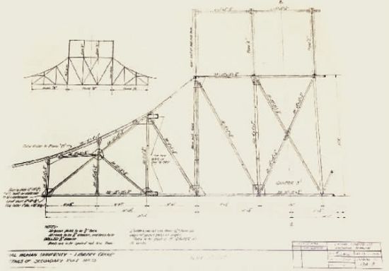 武汉大学老图书馆四楼的钢架结构图。两张设计图都属于本次被评为一级文物的图纸。由美国人开尔斯设计,细节清晰,保存完整。图片来源网络