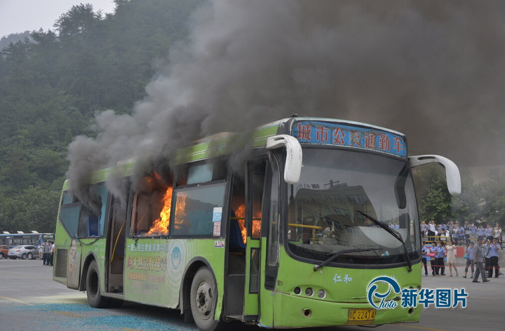 2014年07月10日,湖北十堰举行公交车突发火灾事故应急演练。演练中模拟驾驶员开启应急开关,打开前后车门,在乘客下车后驾驶员最后一个逃离一辆满载了40余名乘客的公交车在行进途中车厢内突发火灾,公交车尾部浓烟滚滚。驾驶员当即刹车停车,在因失火短路车门无法打开的情况下并组织乘客砸窗逃生。