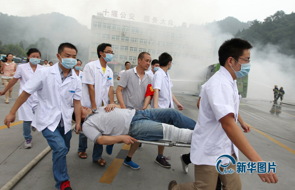 2014年07月10日,湖北十堰举行公交车突发火灾事故应急演练。演练中将受伤乘客扶上担架急救。