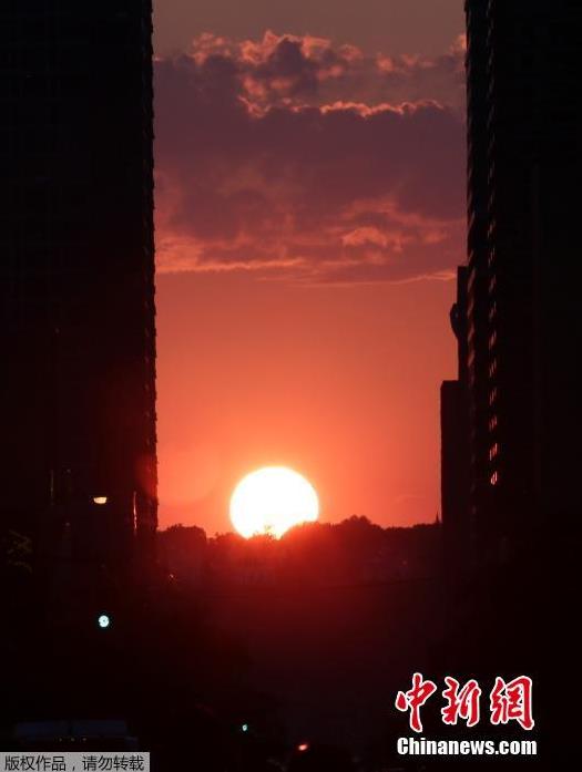 当地时间7月11日,美国纽约曼哈顿再现“曼哈顿悬日”景观,引得路人纷纷围观。据悉,曼哈顿街道大多呈棋盘布局,每年5月底和7月初各有一天日落时分,太阳会精准地落在两排摩天大楼之间,阳光洒满曼哈顿所有东西向街道,形成壮观的“曼哈顿悬日”,时间长达15分钟。