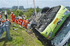 12点45分,临安消防中队22名消防队员赶到现场。发现大巴翻下路基,现场一片狼藉。有多名乘客重伤被压在车底,旁边地上到处散落着车辆撞击后留下的玻璃碎片和车辆部件。