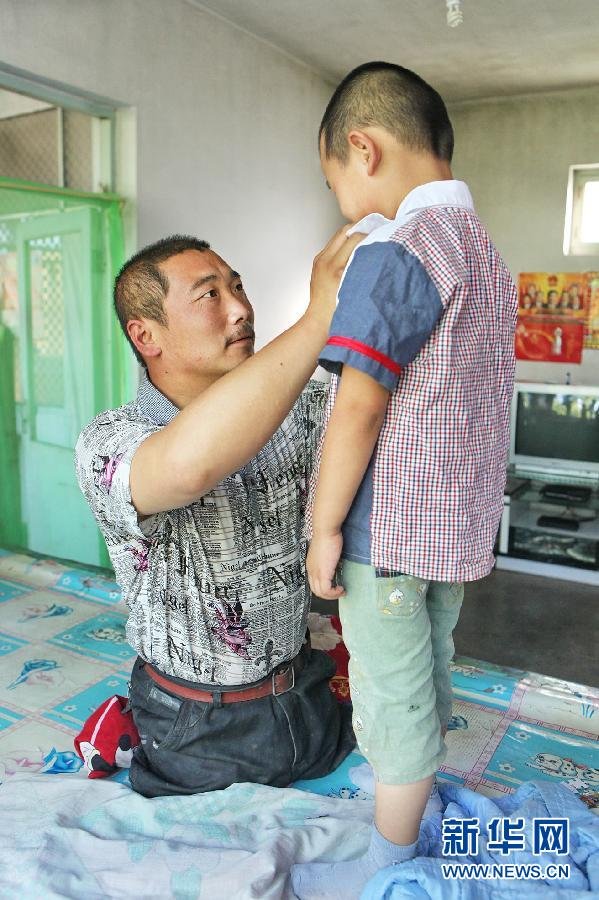 河北省张家口市西榆林村33岁村民王晓兵,7岁时因意外烧伤,造成双腿高位截肢,又因家境困难,只念了初中就辍学在家。身残志坚的王晓兵在政府和亲友的帮助下,学会了修鞋、修锁、配钥匙等手艺。2008年冬天,湖南长沙姑娘李成梅被他感动,千里迢迢来到张家口与王晓兵喜结良缘。如今,他们的儿子已经5岁,妻子李成梅在北京打工。2011年,在村干部的支持下,王晓兵办起养殖场养羊,走上致富创业路,被当地群众称为“无腿硬汉”。新华社记者 杨世尧 摄