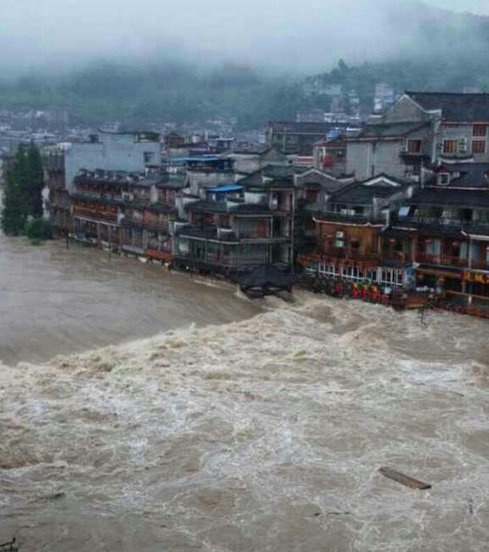 湖南湘西凤凰古城境内的沱江水位猛涨,古城大部分区域进水,景区已经关闭。